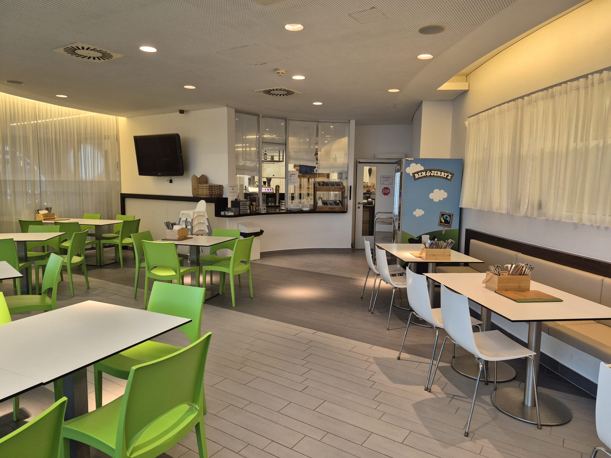 Im Bistro könnt ihr euch bei einem Snack oder erfrischendem Drink stärken. Gönnt euch kleine Leckereien wie Pommes, Pizza und Eis – ideal für eine kleine Pause. Ihr könnt in Badebekleidung (aber bitte nicht tropfnass und mit Badeschuhen) kommen und euch entspannt zurücklehnen.
